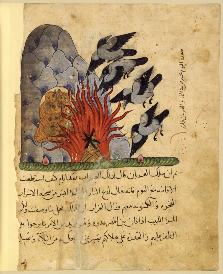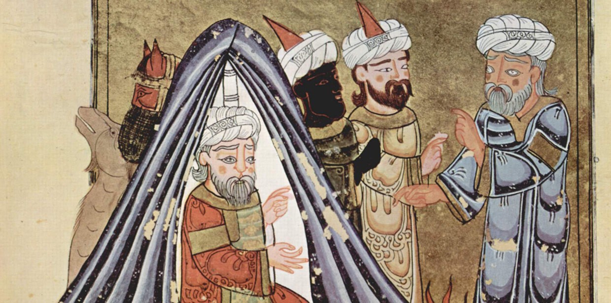 La vie de cour constitue le sujet principal de la peinture : princes assis en majesté, combats d’animaux, danseuses, musiciens… Ce choix de sujets s’explique par le fait que les représentations étaient avant tout dédiées à une bourgeoisie riche et cultivée, capable d’admirer les fresques des palais et de se procurer de luxueux livres illustrés. Les premières peintures de manuscrits se manifestent aux alentours du Xe siècle, mais c’est trois siècles plus tard qu’elles connaissent un véritable âge d’or, en Irak. Les artistes se mettent à illustrer des œuvres littéraires abondamment copiées tout au long de l’histoire arabe, comme les Séances (Maqamat) d’al-Hariri et les fables de Kalila wa Dimna. Ces dernières, rédigées en Inde et traduites en arabe au VIIIe siècle par Ibn al-Mouqaffa, ont été richement illustrées dès le XIIIe siècle. Elles mettent en lumière des scènes d’extérieur avec des représentations animales fantaisistes.