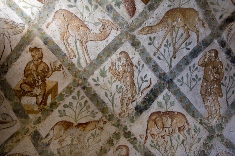 Les sols et les murs des palais édifiés en Syrie et en Jordanie au VIIIe siècle présentent parfois de riches peintures inspirées des créations gréco-romaines, byzantines et perses. Dans les bains de Qusair Amra, en Jordanie, sont représentées des femmes nues ainsi que des scènes de chasse, des animaux, des rois et empereurs, etc. Le palais de Qasr al-Hayr al-Gharbi, en Syrie, rassemble de grandes compositions similaires. Ces édifices étaient situés en marge des villes, c’est pourquoi on les nomme souvent « châteaux du désert », même si ce nom ne reflète pas la diversité de leurs fonctions.