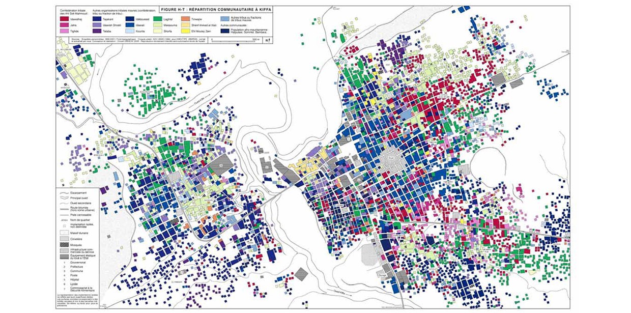 La sédentarisation des nomades s’est traduite par la multiplication, dans les villes, de quartiers fondés sur les liens de parenté. Des confins sahariens aux steppes d’Arabie, les anciens nomades se sont regroupés par familles, lignages ou fractions tribales, autour des principaux équipements urbains ou en périphérie. D’abord provisoire, l’établissement est devenu permanent : la tente s’est doublée d’une construction et le campement s’est transformé en quartier. La localisation des groupes traduit leur spécialisation économique ou le contexte de leur fixation : à Kiffa (Mauritanie), la tribu commerçante des Idawali (en bleu), étrangère à la région mais politiquement proche des autorités, s’est établie très tôt autour du souk et des administrations ; tandis que celles, plus rurales et locales, des Ahl Sidi Mahmoud ou des Laghlal (en rouge et en vert), ont attendu les années 1970 pour s’installer définitivement en raison des sécheresses qui ont décimé leurs troupeaux.