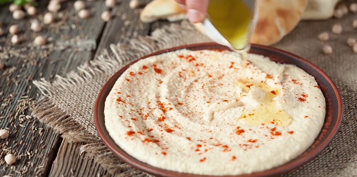Le pois chiche, appelé houmous en arabe, est une légumineuse originaire du Proche-Orient et cultivée dans le Croissant fertile depuis le Néolithique. Le mot houmous désigne également une purée de pois chiches au jus de citron et à la crème de sésame ou tahiné. Selon les recettes, on y ajoute ail, cumin, paprika, piment, voire yaourt. C’est une entrée froide typique de la cuisine libanaise, souvent servie sur du pain arabe, mais elle est aussi présente de manière plus générale dans les pays de l’ancien Empire ottoman.