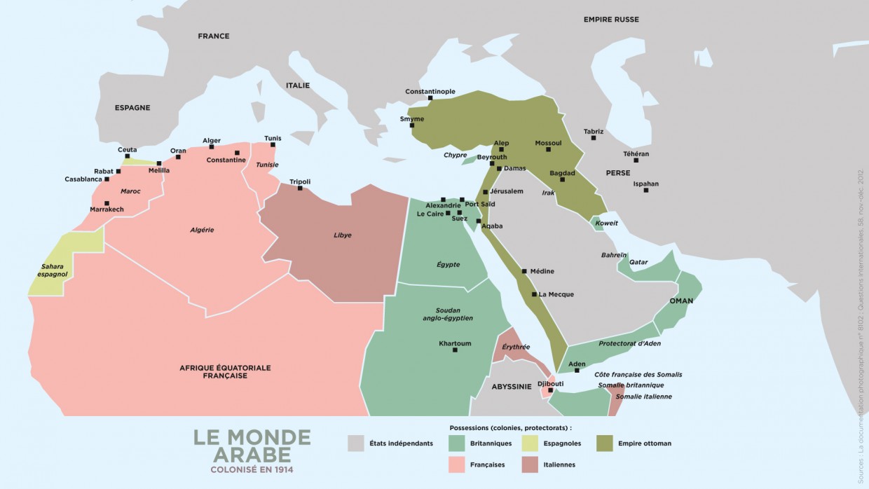 Au XIXe siècle et au début du XXe siècle, l’Europe (principalement la France et l'Angleterre) colonise progressivement l'ensemble du monde arabe. Le contexte est alors propice : la totalité des pays arabes, à l’exception du Maroc, est administrée depuis plusieurs siècles par l’Empire ottoman. Ayant pour capitale Istanbul, celui-ci a connu son heure de gloire au milieu du XVIe siècle, lorsque le souverain Soliman le Magnifique était arrivé avec ses armées jusqu'aux portes de Vienne. Mais trois cent ans plus tard, il est devenu « l'homme malade de l'Europe » et voit le territoire qu'il domine diminuer petit à petit, alors que les appétits européens, stimulés par la montée en puissance des nationalismes et des nouveaux besoins dus à la révolution industrielle, sont quant à eux de plus en plus voraces.