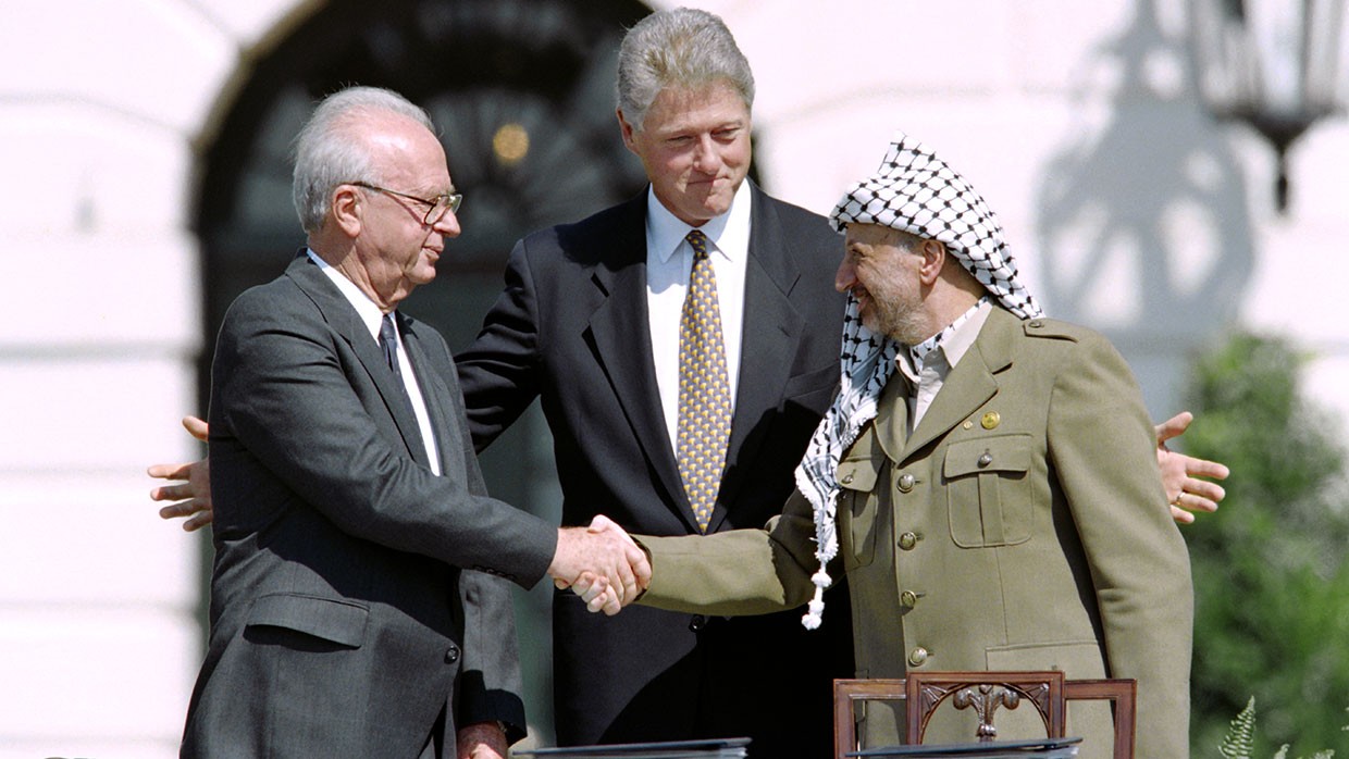 La photo a fait le tour du monde : en 1993, Yitzhak Rabin, premier ministre d’Israël, et Yasser Arafat, représentant de l’Organisation de Libération de la Palestine (OLP), se serrent la main, embrassés par le président des États-Unis, Bill Clinton. Ce geste symbolise les accords d’Oslo, dans lesquels Israël et l’OLP se reconnaissent mutuellement, et Yasser Arafat promet de renoncer au terrorisme. Issus d’un un contexte socio-politique favorable et de mois de négociation, les accords d’Oslo ont représenté un immense espoir pour le règlement du conflit israélo-palestinien, mais le processus a rapidement montré ses limites, et la région n’a pas tardé à s’embraser à nouveau.