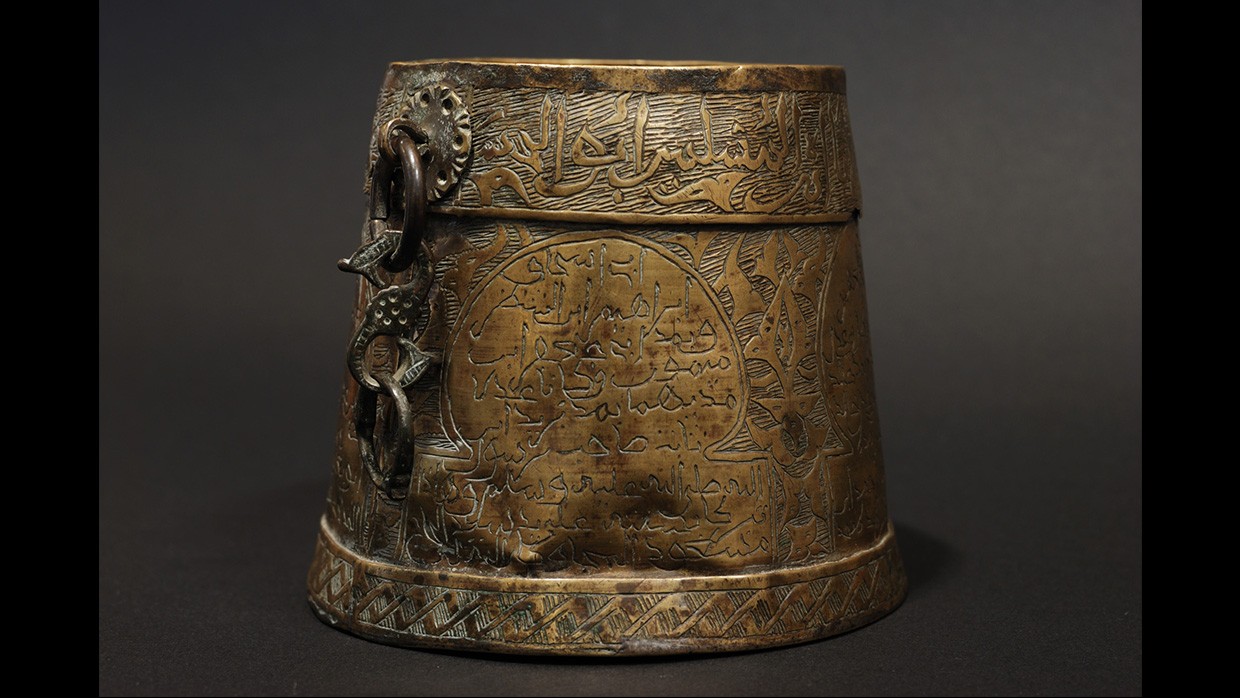 Fabriqué au Maghreb au XIVe siècle, cet objet se désigne lui-même sous le nom de moudd, terme qui provient du latin modius ou modium, « boisseau ». Il s’agit donc d’un récipient servant à mesurer un volume de liquide ou de solide… mais pas n’importe lequel ! Celui de l’eau nécessaire aux ablutions et celui de l’aumône légale, la zakat. Son versement constitue l’une des principales obligations des musulmans, et son volume a été déterminé par Muhammad lui-même. Destinée aux pauvres, elle portait à la fois sur les métaux précieux, les mines et surtout les biens agricoles. De ce fait, elle était souvent payée en nature, en céréales par exemple. Le calibrage du moudd était donc une affaire d’État, comme le rappellent les inscriptions présentes sur celui-ci.